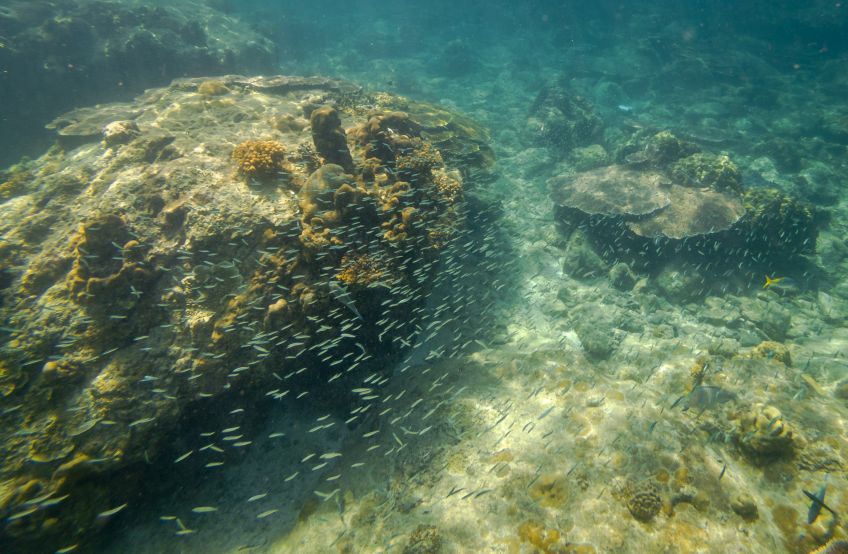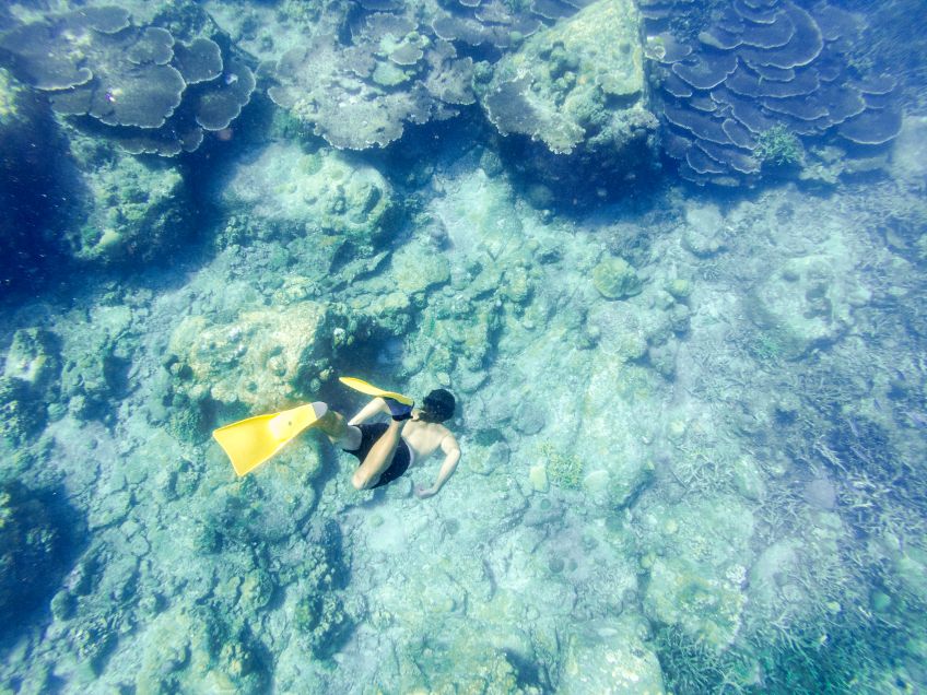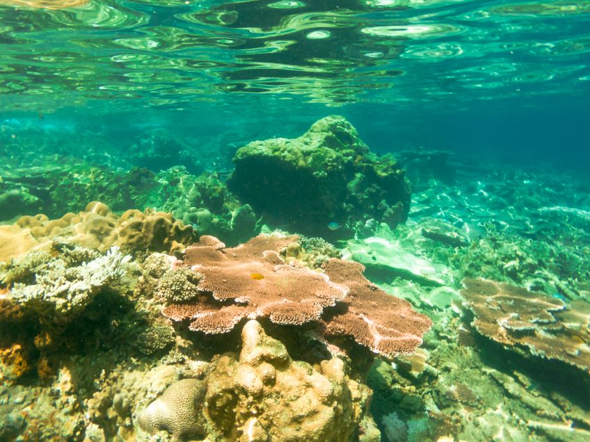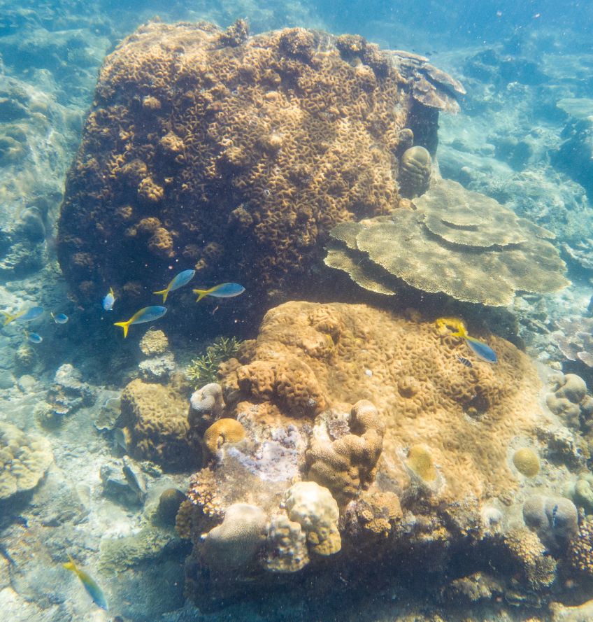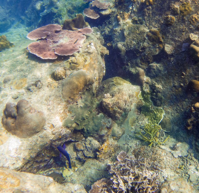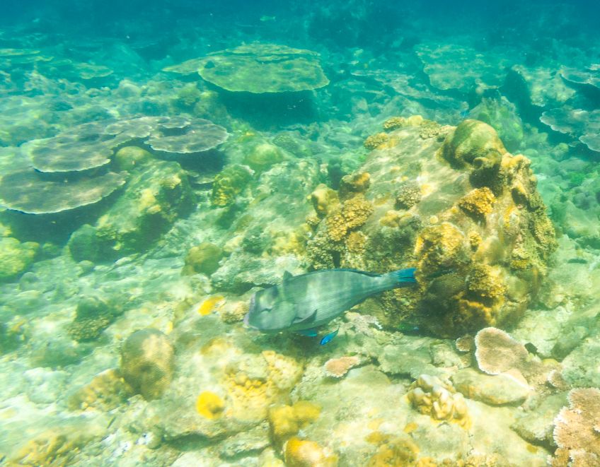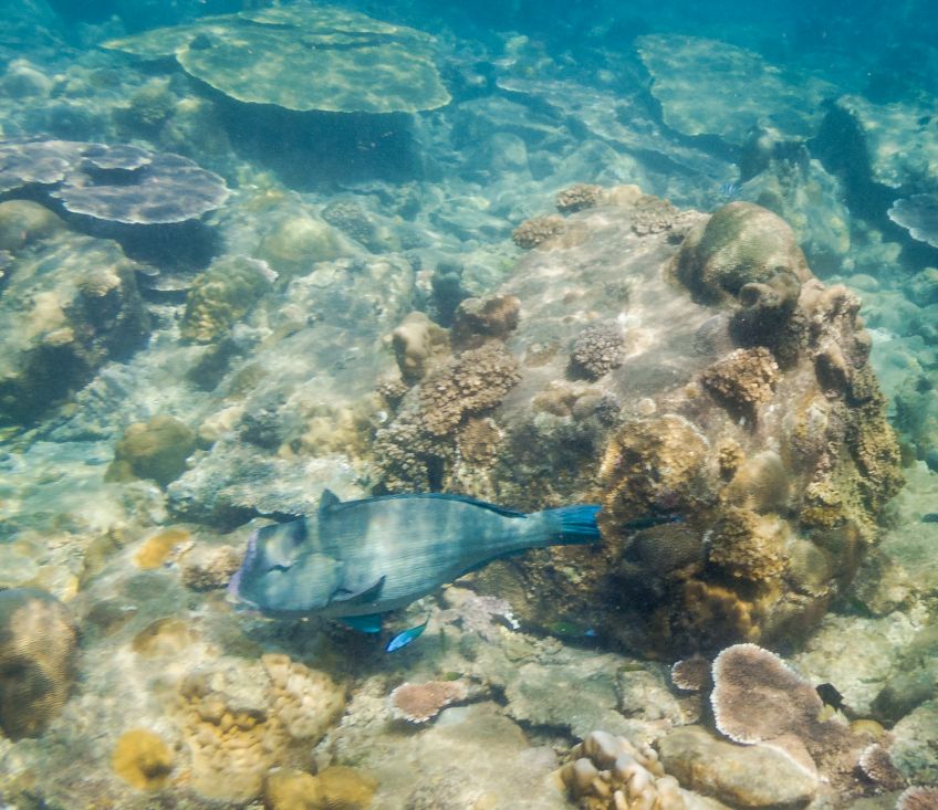 An unserem letzten Tag verabschiedete sich die Insel mit einem ganz besonderen Geschenk von uns: Wir hatten den Tag mit Sonne liegen, quatschen und Erlernen von neuen Kartenspielen verbracht. Also beschloss ich am Nachmittag noch eine Runde schnorcheln zu gehen, während Jakob ein Nickerchen in der Sonne hielt. Ich paddelte also gemütlich zu der Stelle an der ich ein paar Tage zuvor eine schwarz-weiß gestreifte Seeschlange gesehen hatte und sah plötzlich einen der Riesenbüffelkopf-Papageienfische, die ja mit ihren bis zu 1,5m ziemlich beeindruckend sind! Und dann wurden es immer mehr von ihnen – eine ganze Horde von insgesamt 17 gigantischen Fischen schwamm direkt unter mir im Wasser – es war gleichzeitig faszinierend und beängstigend alleine mit dieser grasenden Herde im Wasser zu sein!! Hin- und hergerissen drehte ich schließlich um und probierte von einem Floß aus die am Strand liegenden Alex, Ant und Jakob auf mich aufmerksam zu machen, damit sie sich dieses besondere Spektakel ansehen konnten – keine Reaktion… Ich schwamm zurück, holte Ant und Jakob mit ins Wasser und wir gingen die Herde suchen, die mittlerweile den Standort gewechselt hatte.