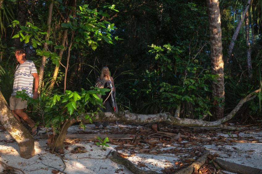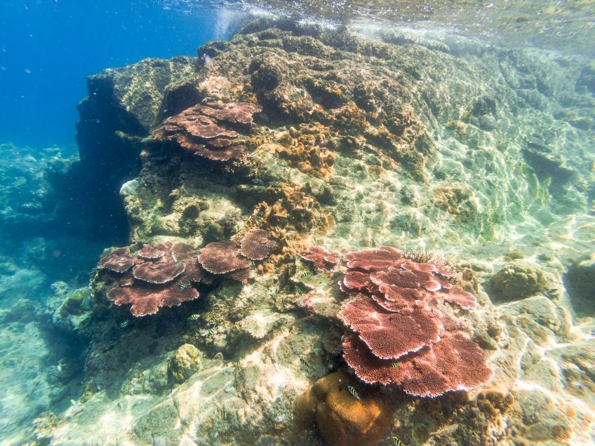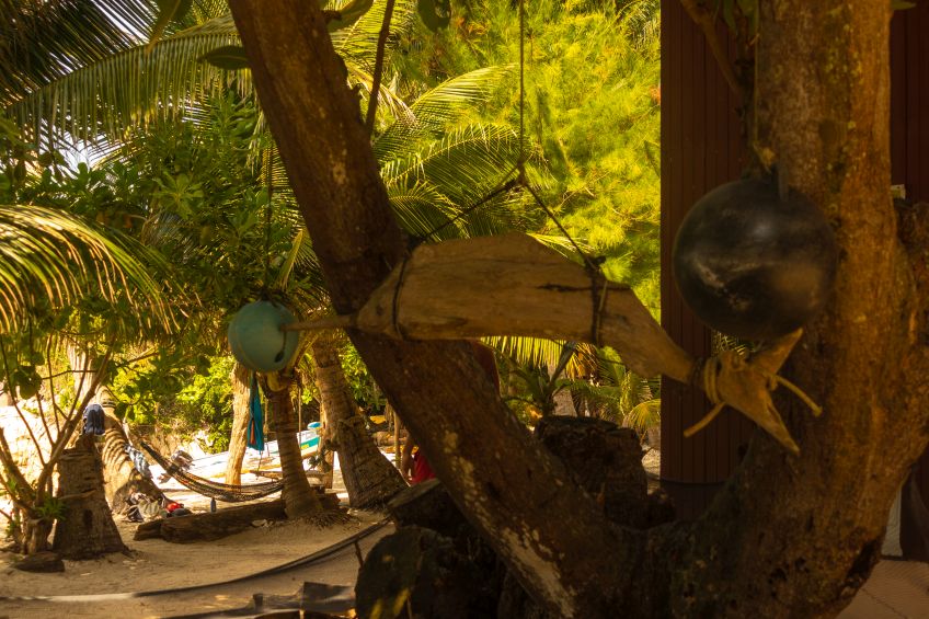 Der nächste Tag startete gleich mit einem Tauchgang zum Tempel of the Sea – eine riesige Korallenpyramide mitten im Meer! Die Strömung war stark, wir blieben auf einer Seite des Riffs und entdeckten Skorpionfische, Bambushaie, Blaugepunktetete Stachelrochen, Moränen, Aale und viele, viele Fische in bunten Farben (Kugelfische, Papagaienfische, Schmetterlingsfische, Anemonenfische,…). Zurück im Restaurant der Unterkunft beobachteten uns neugierige Flughörnchen beim leckeren Mittagessen bevor wir uns zu einer weiteren Schnorcheltour aufmachten. Endlich sah auch ich einen Hai und wir entdeckten Riesenbüffelkopf-Papageienfische bis wir schließlich beide schmerzhafte Bekanntschaft mit einem Schwarm pinker Quallen machten. Somit vorerst genug vom Schnorcheln, gings zurück an den Strand und Essig auflegen – es stellte sich als weniger schlimm als erwartet heraus – aber die Quallen besiedeln den Strand einen weiteren Tag lang, weshalb wir vom Schwimmen Abstand nahmen und derweil in den Hängematten rumhingen. Die Wunden wieder einigermaßen verheilt – übrigens auch die Bisse der Flöhe, die sich in meinem Pulli eingenistet hatten – begrüßten wir Alex und Ant mit denen wir uns hier erneut verabredet hatten und die mit ihren ca. 50 Jahren immer noch auf die gleiche Art reisen wie wir es tun.