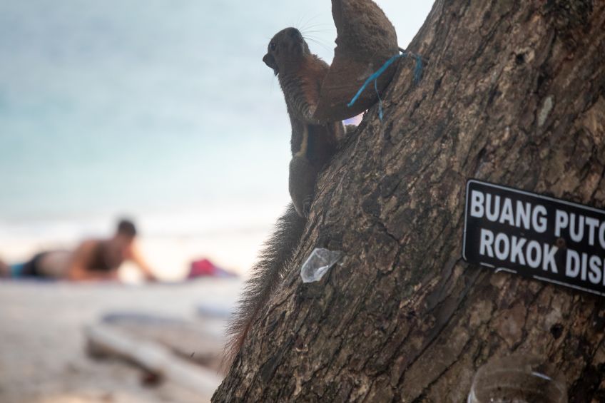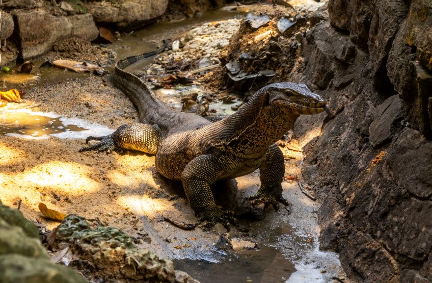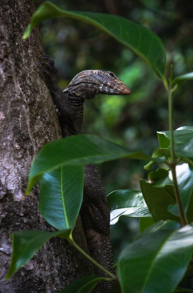 Viel süßer waren hingegen die Eichhörnchen die uns im Restaurant beim Essen Gesellschaft leisteten und gemütlich an den für sie aufgehängten Kokosnussresten knabberten, während wir köstliches Essen verspeisten. Und es gab Warane – zuerst fielen uns nur die kleineren auf, bis die ersten Großen (von 1,5m bis zu 2,5m) einfach mal so gemütlich quer über den Strand watschelte! Da waren wir richtig am Staunen – und die Kamera natürlich weit weg! Zum Glück bekamen wir noch öfters Besuch von größeren Echsen und konnten auch hin und wieder beobachten, dass diese Tiere sowohl am Boden als auch auf Bäumen ziemlich schnell werden können, wenn erforderlich!
