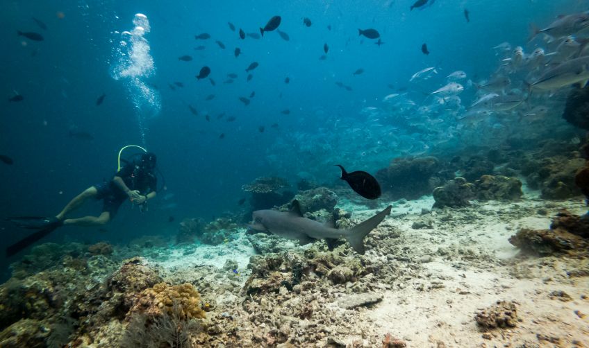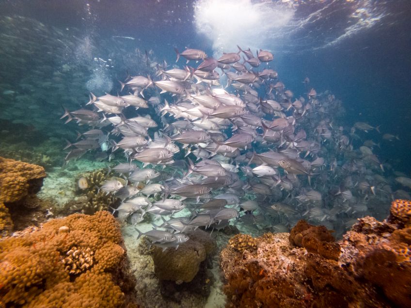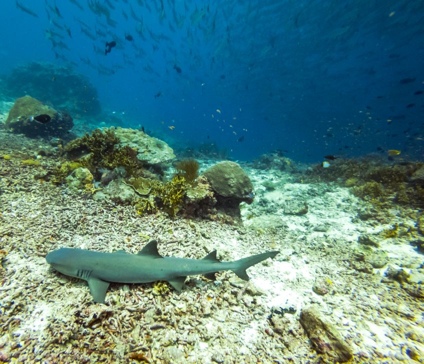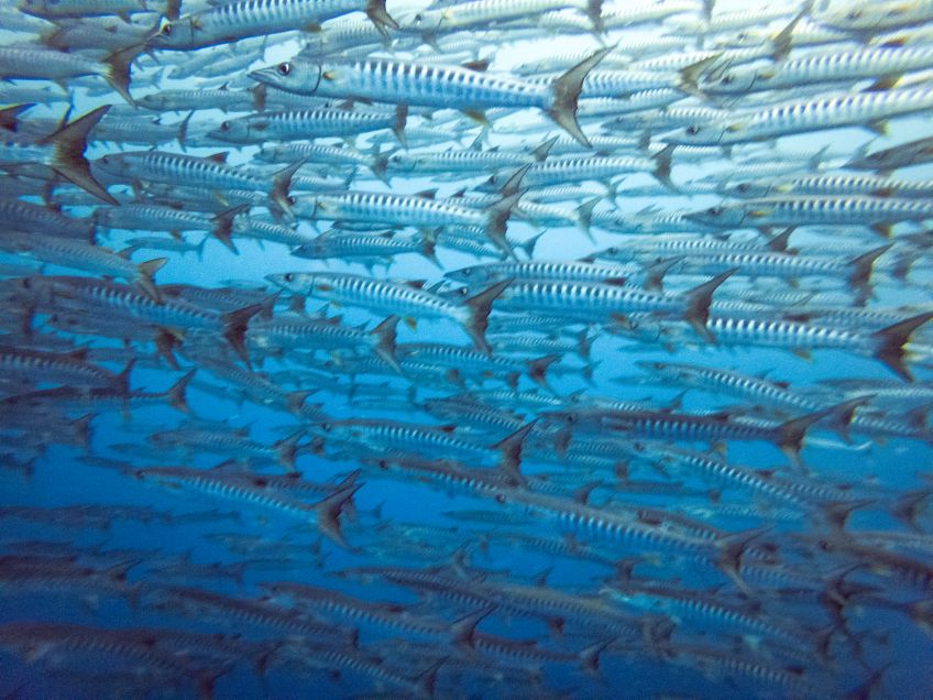 Der dritte Tag war noch nicht angebrochen, trotzdem aufstehen um 04:30, weil die Abfahrt nach Sipadan für 05:30 geplant war. Leider hatte es diesmal Jakob erwischt, er hatte etwas Falsches gegessen und entschied sich, lieber die Toilettenschüssel zu umarmen, als tauchen zu gehen… So zog ich also alleine los, während sich Jakob darauf konzentrierte möglichst schnell wieder fit zu werden! In Sipadan angekommen, mussten wir uns erstmal registrieren lassen und wurden darauf hingewiesen von Erkundigungen der Insel Abstand zu nehmen, da die darauf stationierte Militäreinheit keinen Spaß versteht. Dann ging es los zum ersten von insgesamt 4 Tauchgängen an diesem Vormittag. Die Meeresschildkröten in allen Größen, hatten sich ebenso wie die Riffhaie gemütliche Plätzchen am Grund gesucht, um wahlweise ein Nickerchen zu halten oder sich von den kleinen Putzerfischen reinigen zu lassen. Ein ganz besonderes Erlebnis an diesem Tag war der Schwarm von Barracudas, der sich mit zunehmender Strömung zu einer Mauer formierte hinter der wir eine Zeit lang herschwammen, um uns schließlich weitertreiben zu lassen.