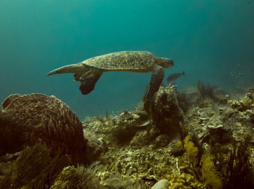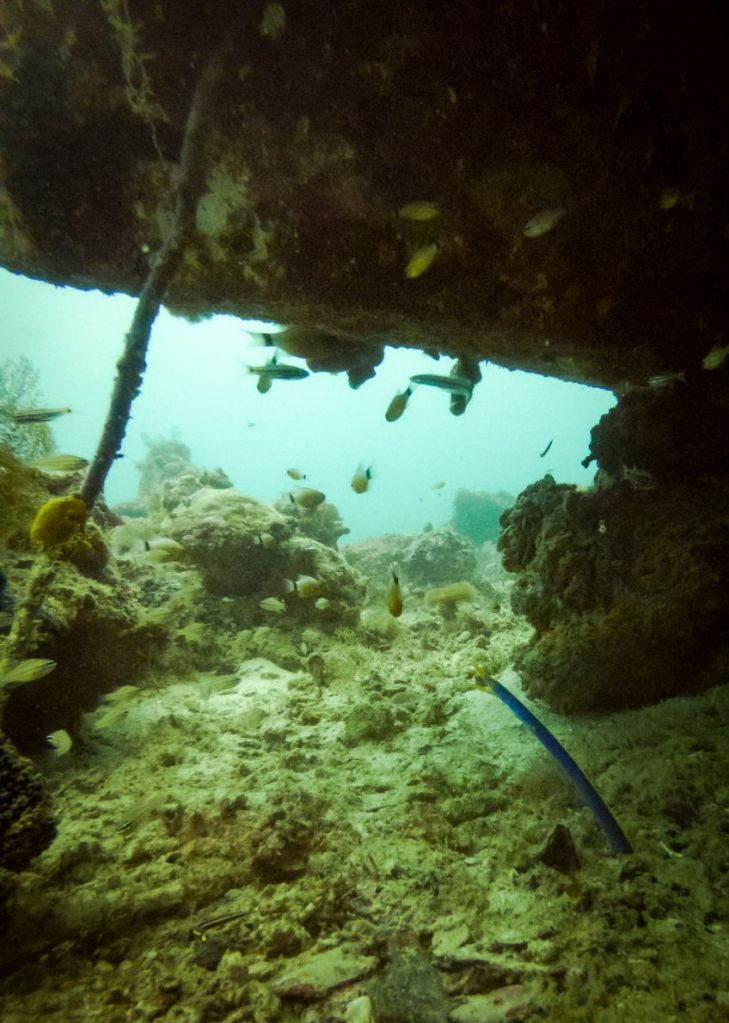 Und dann ging es los mit dem ersten Tauchgang gemeinsam mit einem chinesischen Vater-Sohn-Pärchen – bald hatten wir verstanden, worin die Genervtheit hinsichtlich der chinesischen Touristen bestand! Alle waren tauchbereit – aber wo waren die Chinesen? Es ging dann doch los und es war ein tolles Gefühl wieder unter Wasser zu sein – die Schwerelosigkeit, die Masse an Leben unter Wasser und wir schwammen einfach ruhig zwischen den Fischen und den Wracks durch. Am Hausriff begegnete uns gleich schon die erste Meeresschildkröte, viele bunte Fische und sogar ein ganzes Tuktuk war halb im Sand eingegraben. Wir waren noch recht unsicher bezüglich unserer Tauchfertigkeiten, umso mühsamer war es ständig von einem der Chinesen angerempelt zu werden.