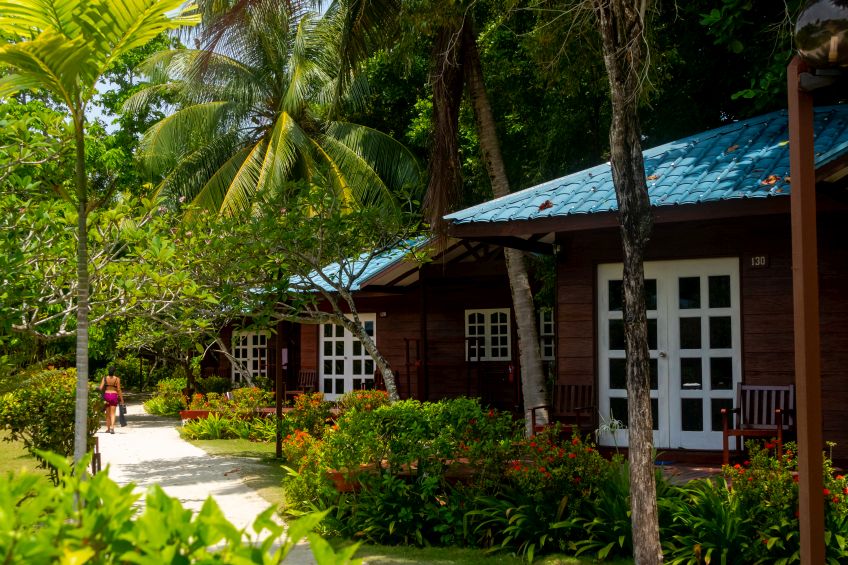 Beim Steg angekommen, wurden wir gleich darüber informiert, dass nach dem Mittagessen schon die ersten zwei Tauchgänge beim Hausriff anstehen – Juhuuu!! Wir wurden durch die Bungalowanlage geführt, machten Bekanntschaft mit den ersten Riesenechsen und bekamen eine Einführung mit einer Power Point Präsentation. Dann wurde der Bungalow bezogen – weiße Bettbezüge, weiße Handtücher und viiiiel Platz!! Sogar eine Terrasse in den Garten hatten wir 😀 Nach einer ersten schnellen Dusche (einziger Kritikpunkt: das Wasser stank abartig nach Kloake!) gings zum Mittagsbuffet mit richtig leckerem Essen. Danach erstmal Equipment checken und schon die ersten Infos bekommen, dass chinesische Touristen sich keiner besonderen Beliebtheit erfreuen…