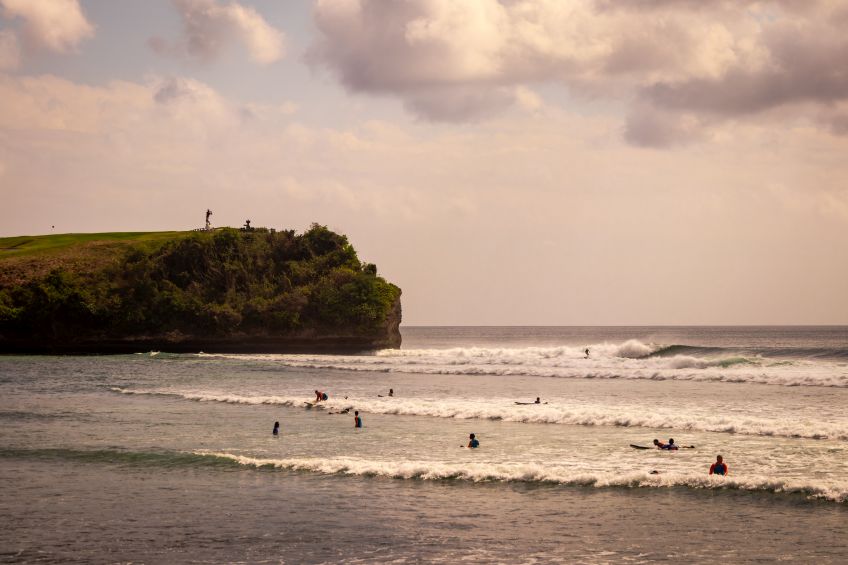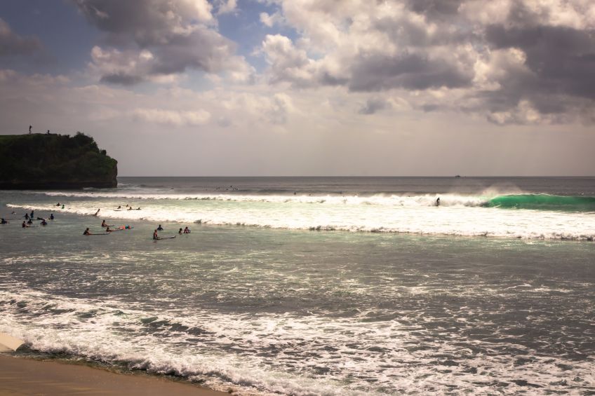 Deshalb schnappten wir uns am nächsten Tag nach einem köstlichen Frühstück gleich das Moped und fuhren zum Jimbaran Beach. Ein riesiger Strand mit kleinen Restaurants und doch einigen Touristen – wir sind noch immer verwöhnt von den einsamen Bilderbuchstränden in Malaysien. Wesentlich besser gefiel uns jedoch die anderen Strände am Weg zum Uluwatu Beach, trotz vieler, vieler Surfer – Jakob spielte schon mit dem Gedanken einen Kurs zu machen – was nicht allzu überraschend war 😀