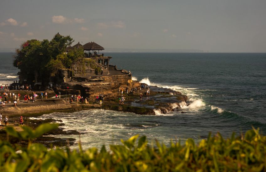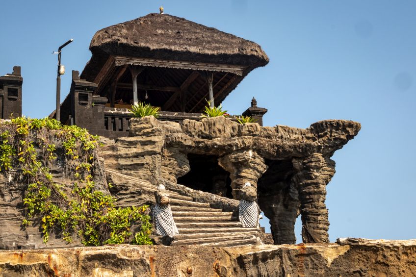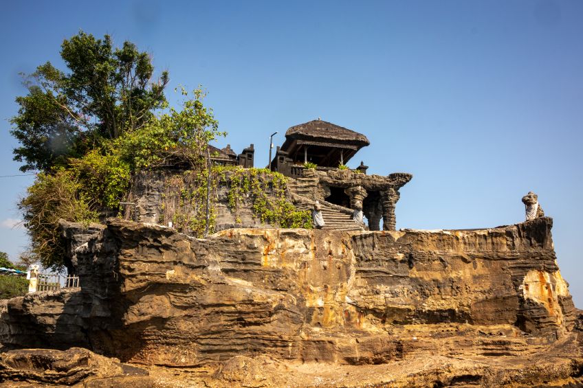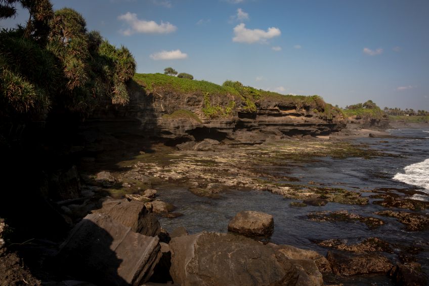 Ein besonderer Ausflug war zum Tempel Tanah Lot. Auf einem geliehenen Moped sind wir quer durch die Reisfelder gekurvt bis wir schließlich an der Steilküste ankamen. Tanah Lot steht auf einer Klippe und wird von Wellen zum Zittern gebracht. Rundherum sind flachgespülte Steine, Höhlen und weitere Klippen – fast mehr noch als der Tempel, hat uns die raue Landschaft dort beeindruckt!!