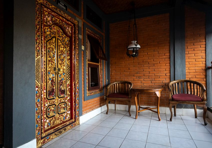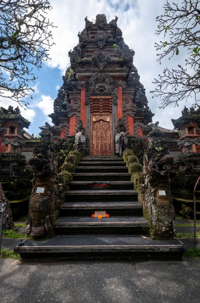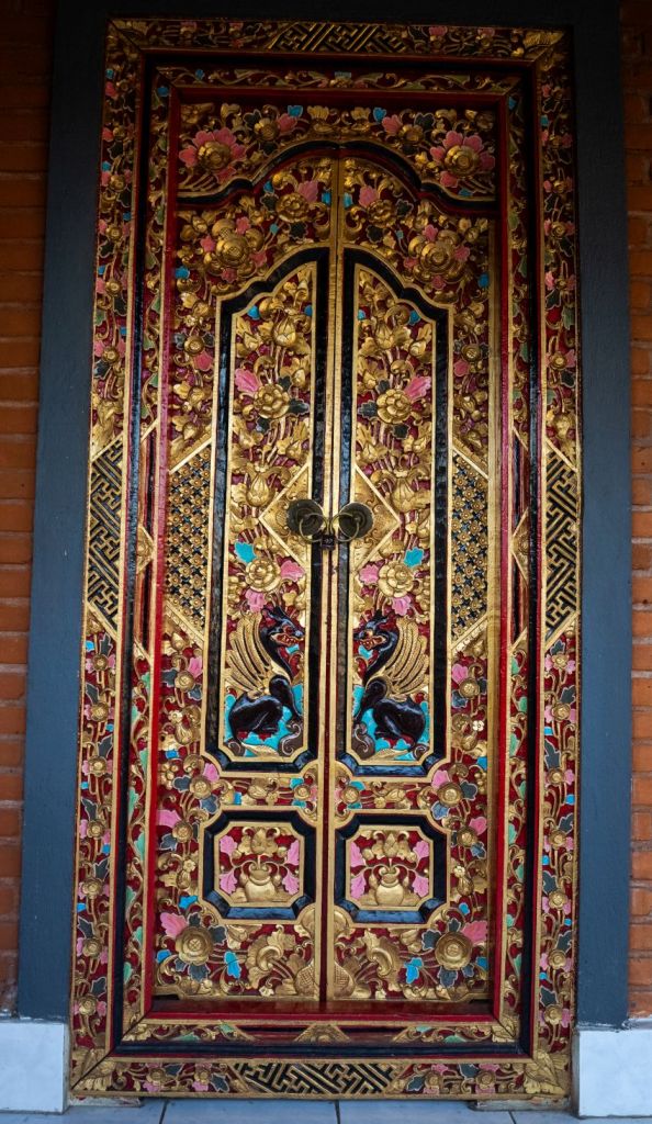 Ja, die Transportwege sind manchmal lang, auch wenn die Kilometeranzahl sehr gering erscheint – 3 Stunden und ca. 30km weiter nördlich waren wir in Ubud angekommen – Unterkunft von außen unscheinbar, von innen ein Gefühl wie in einem Tempel zu stehen – vor allem die Türen gefielen mir!! Erstmal unsere Sachen abgestellt und da es ausnahmsweise nicht ganz so heiß war kein Bad im Pool genommen, sondern gleich mal die Hauptstraße erkunden. Ubud ist ein kleines, schmuckes Städtchen mit sehr vielen verzweigten Gassen, unzähligen Souvenirshops und viel, viel Grün – Reisfelder und Dschungel mitten in der Stadt. Wir wanderten also die Hauptstraße entlang, immer darauf achtend nicht in die Löcher im Gehsteig in den etwa 1-1,5m darunter liegenden Kanal zu fallen und gleichzeitig den erstaunlich vielen Touristen aus der ganzen Welt sowie den unzähligen Autos und Mopeds auszuweichen. Am Ende angelangt, gab es eine kleine Stärkung – auch Nervennahrung genannt – bevor Jakob mit mir Ohrringe kaufen musste…