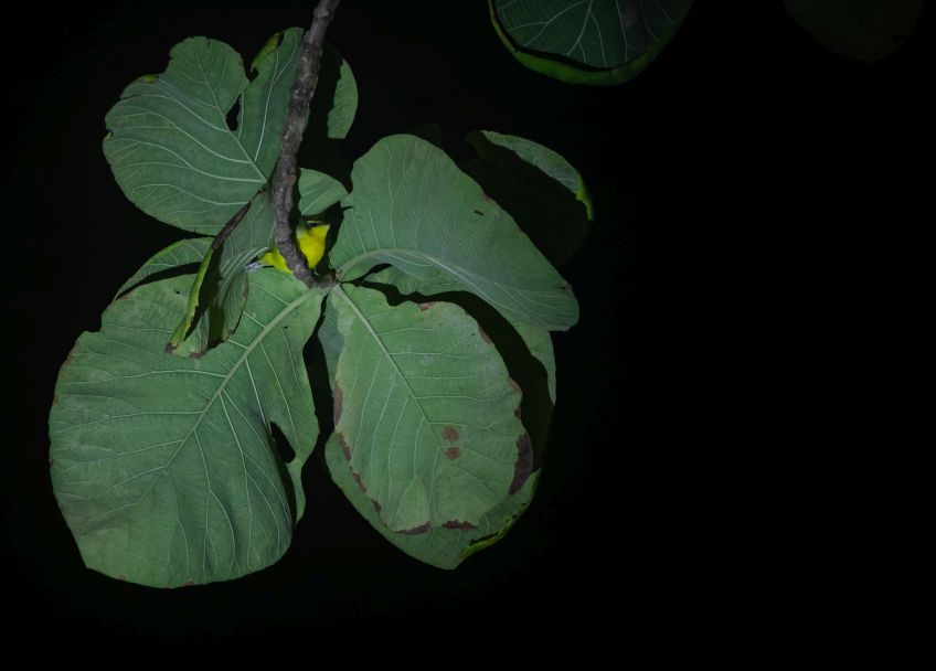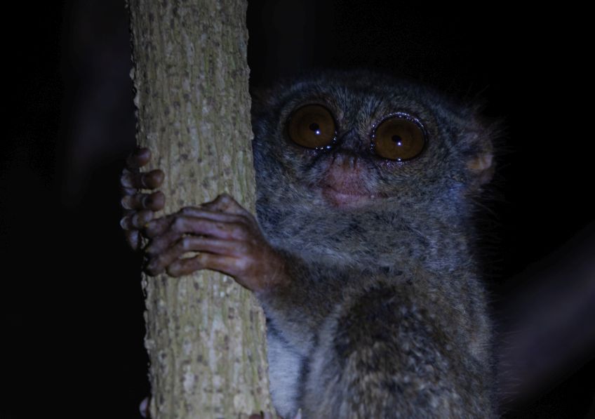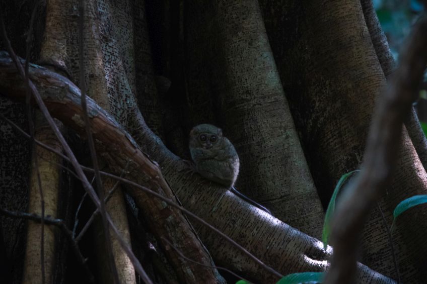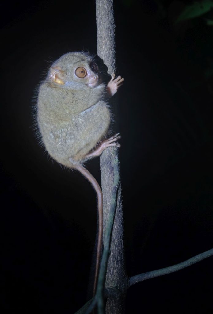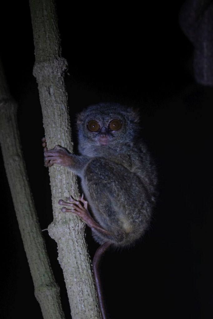 Nach dieser schon sehr schönen Begrüßung ging es gegen 17h00 zur Nachtwanderung in den Nationalpark. Wir waren nur eine kleine Gruppe – wir zwei und der Guide – und trafen auch nur beim Tarsius (Koboldmaki) Nest auf andere Touristen. Gespannt warteten wir dort die Dämmerung ab, bis die kleinen Tierchen mit den großen Augen aufwachten und den Schlaf abschüttelten, um sich dann auf die Jagd zu machen. Danach ging es weiter durch den stockdunklen Wald, um zwei Taranteln, eine Schlange und einen nur wenige Zentimeter großen Zitronenvogel zu entdecken. Glücklich ließen wir den Abend schließlich noch gemeinsam mit einem französischen Koch ausklingen und gingen zeitig schlafen, da es ja schon um 05h00 am nächsten Tag weiter ging – die Morgenwanderung!