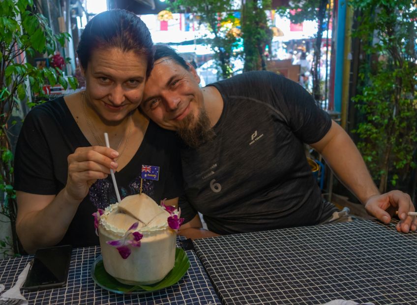 Mit den neu eingeführten Linienbussen ging es nach einem langen Tag und Flugverspätungen schließlich in unsere Unterkunft, um ein wenig Schlaf zu bekommen. Früh am nächsten Tag machten wir uns voller Vorfreude auf um Nadja und Didi in Empfang zu nehmen, die uns die nächsten Wochen begleiten sollten. Auch sie machten bei der Ankunft schon Bekanntschaft mit der asiatischen Gemütlichkeit, kamen aber schließlich wohlbehalten in der Stadt an. Nach kurzer Reinigung und Frühstück tauchten wir gleich gemeinsam in den großen Wochenendmarkt Chantochak ein – Respekt vor den zweien nach einem anstrengenden Flug, das ganze Gewusel und Gewurle auf dem farbenfrohen Markt zu bewältigen! Doch schon einigermaßen geschafft, aber mit guter Ausbeute, machten wir es uns gegen Abend auf einer Terrasse in der Kaosanroad gemütlich und beobachteten das bunte Treiben aus der Entfernung. Nach so vielen frittierten Käfern, Skorpionen, Fröschen und Maden konnte Didi schließlich am Rückweg zum Hotel einfach nicht widerstehen und kostete einen Grashüpfer… knackig-knusprig war der Kommentar!