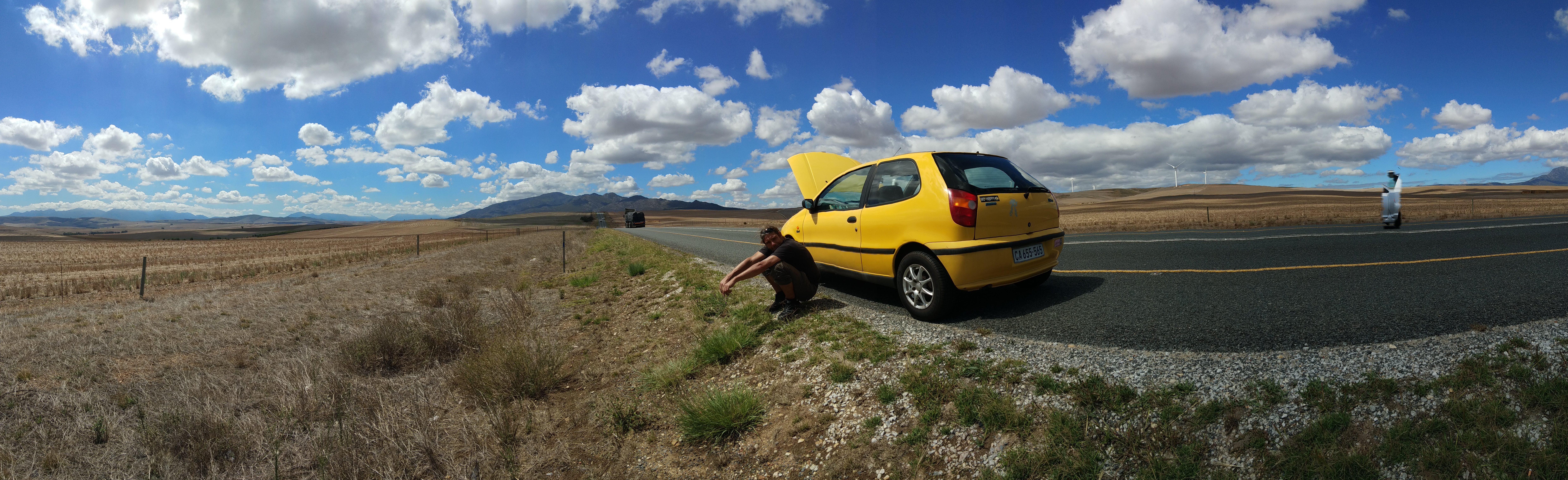 Die Zeit verging wie im Flug und schon bald saßen wir zu zweit im kleinen gelben Bumblebee auf dem Weg zu unserer ersten Safari – allerdings hatte unser fahrbarer Untersatz andere Pläne… Nach nur einer guten Stunde beschloss es, dass es nun genug sei mit der Fahrerei und wir hatten eine Panne mit wunderschöner Aussicht!